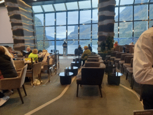 Torsdagen 2 oktober Anländer Flåm tidigt på morgonen, grått disigt och lätt regn. Amelie går iland och tar en kort promenad. Det verkar som den lilla byn och hamnen är byggd för turister. Allt mycket kommersiellt. Där finns en liten vikingakyrka. Där inne grillar man och har en bar. Amelie kommer snabbt tillbaka till båten. …