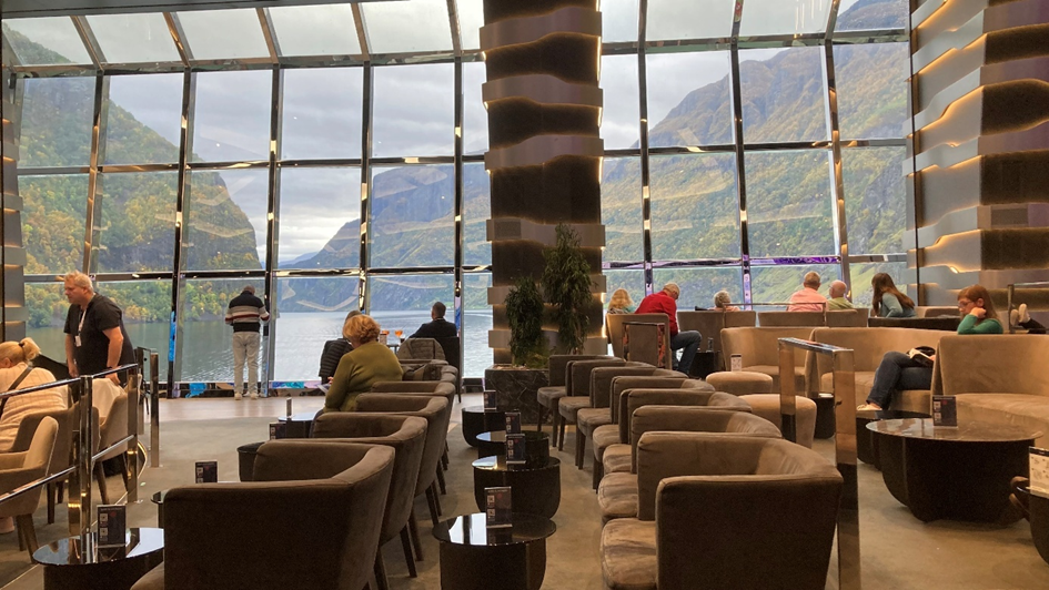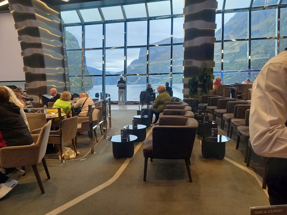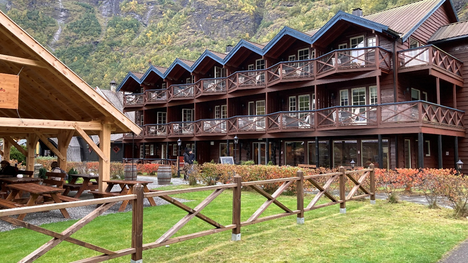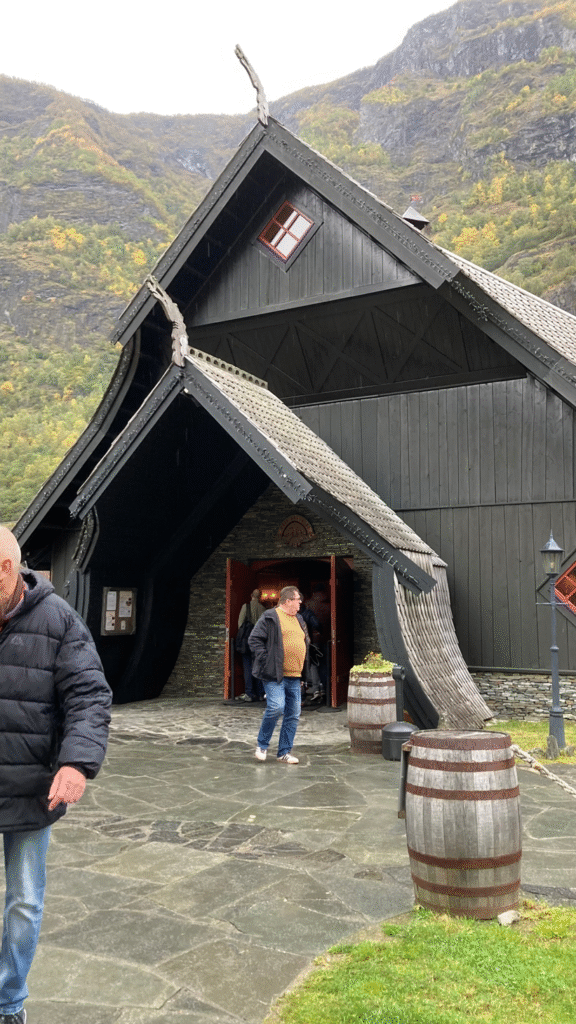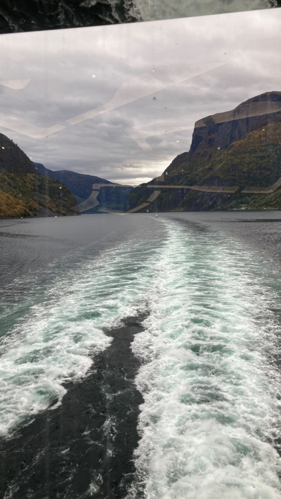 Anländer Flåm tidigt på morgonen, grått disigt och lätt regn.