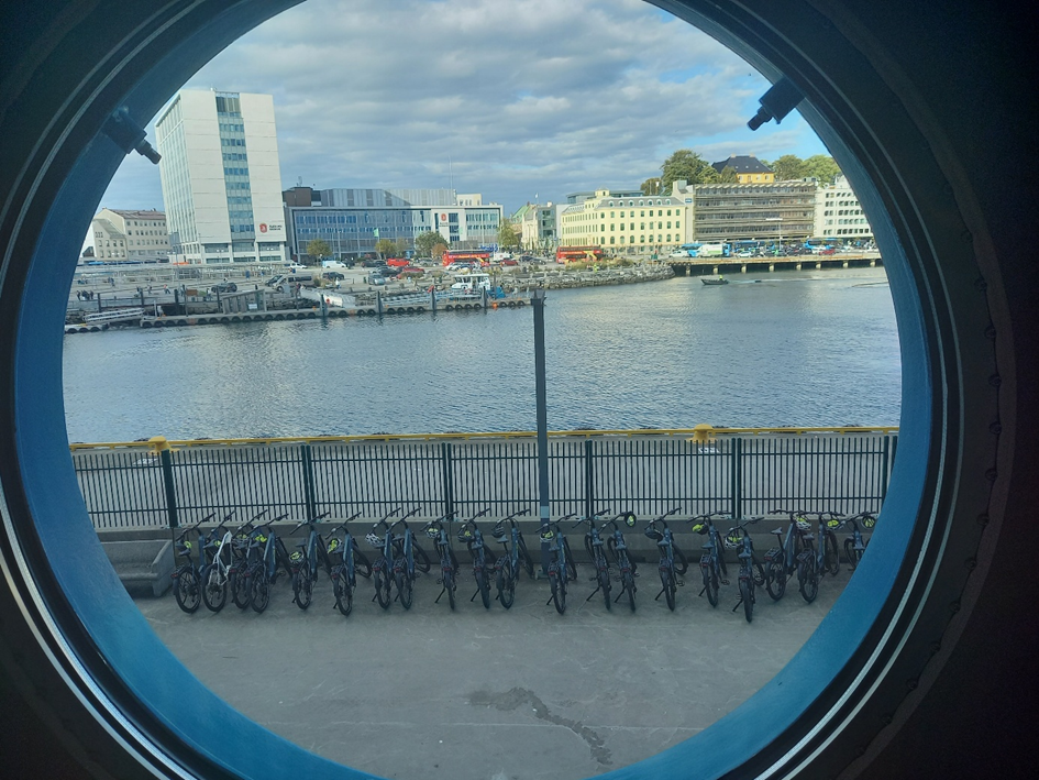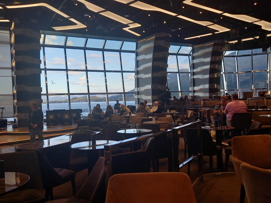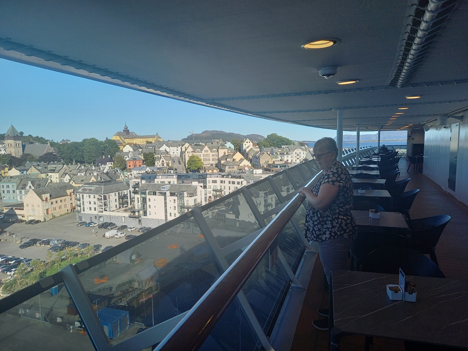 Ankommer Ålesund tidigt på morgonen, soligt och 14 grader. Tar det lugnt och äter en sen frukost i buffe´n . vi avser hoppa lunchen. Utsikten från båtens 15 däck är fantastiskt.