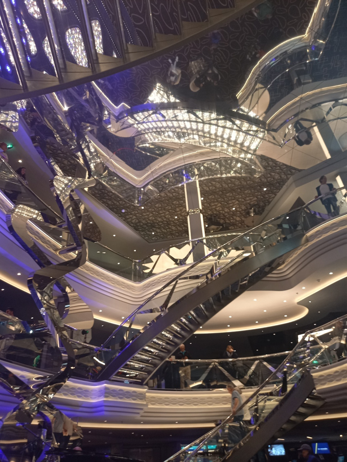 Efter den högljudda men väldigt fina musiken under flera timmar sätter vi oss i den centrala trapphallen i båten och tar oss en drink.