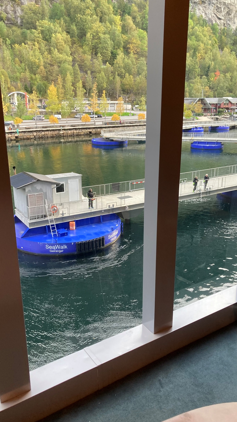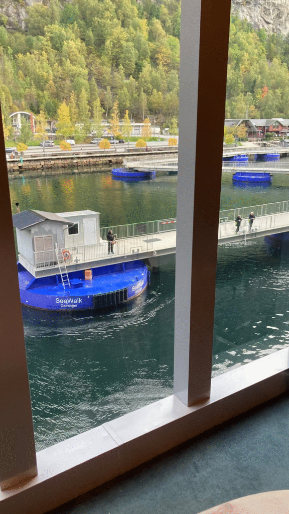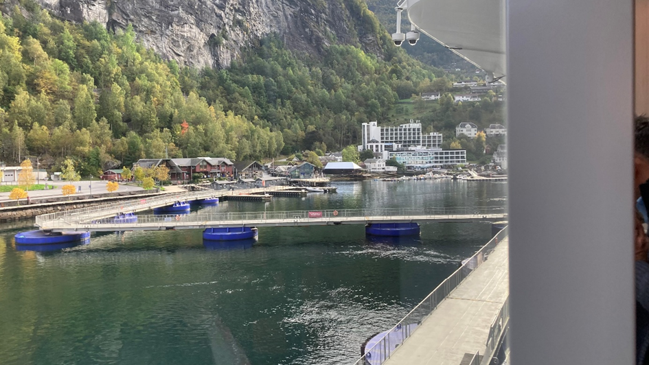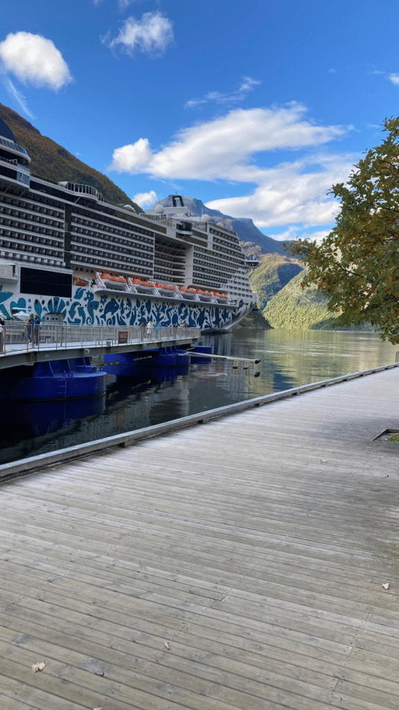 Vi ankommer Geiranger klockan elva precis en timme före tidtabellen. Här har man flytande gångbord som skjuts ut till fartyget och som man får gå iland på.