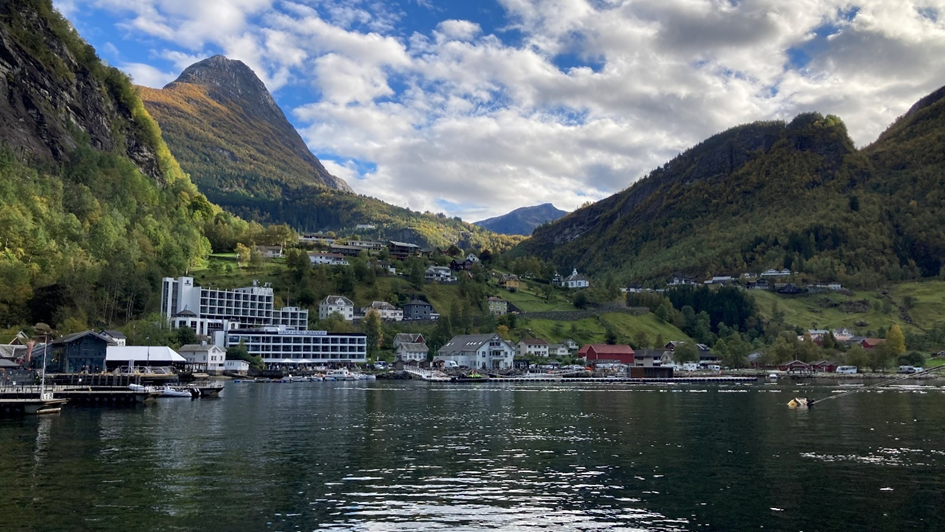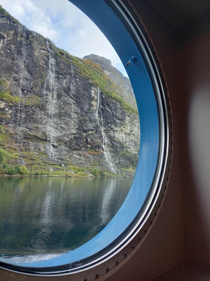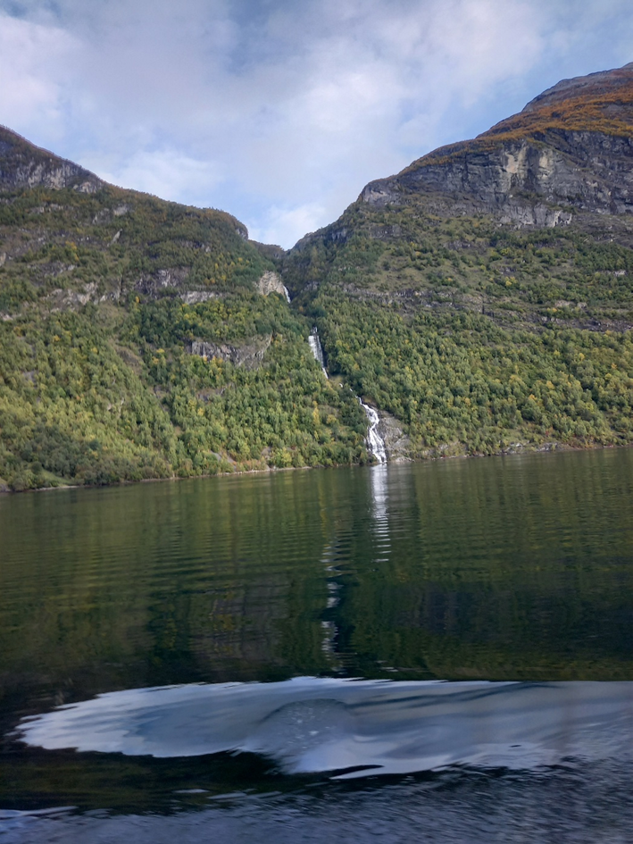 Under nattens mörker har fartyget tagit sig in till Hellesylt där vi släpper av några som ska fortsätta med buss genom bergsmassiven till Geiranger och möta upp oss där ikväll. Otrolig vilka branta klippsidor ochvilka vattenfall vi passerar under vår snirklande färd intill Geiranger.