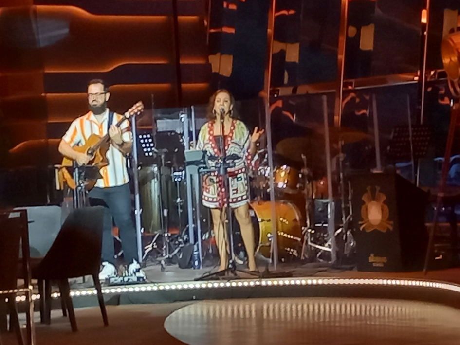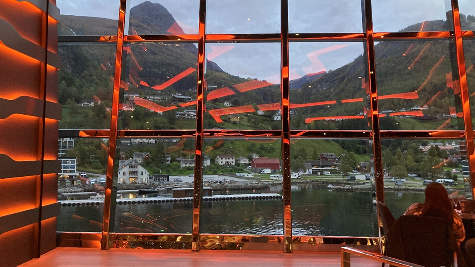 Efter maten förflyttar vi oss baktill Carousel Lounge och utsikten akterut mot Geiranger i skymningen. Snart dras fonden ner och showen kan börja .