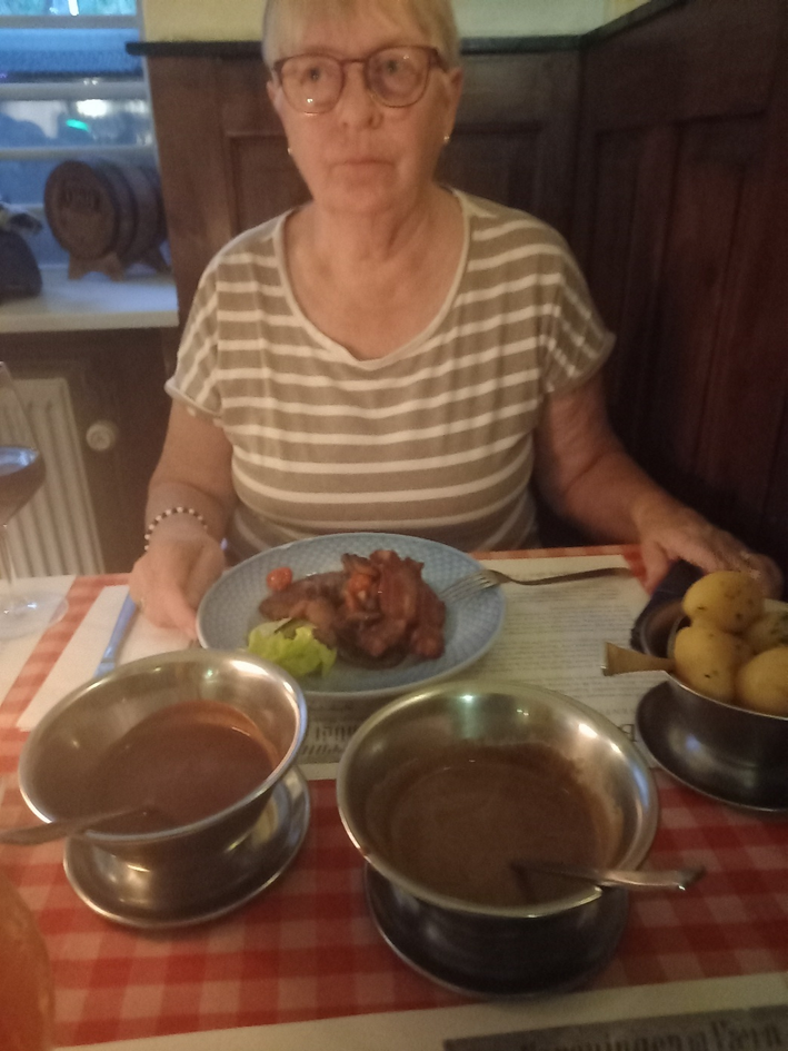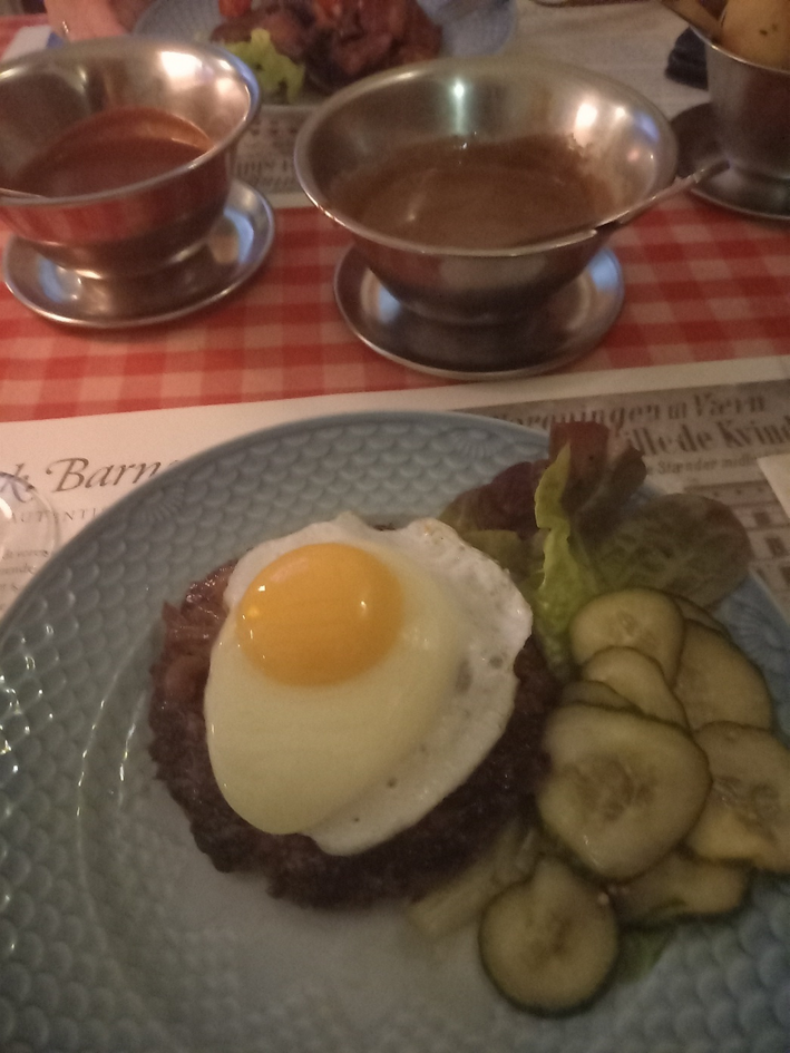 Amelie beställer levergryta och Anders en 300 gr köttfärsbiff med potäter gurka och stekt ägg.