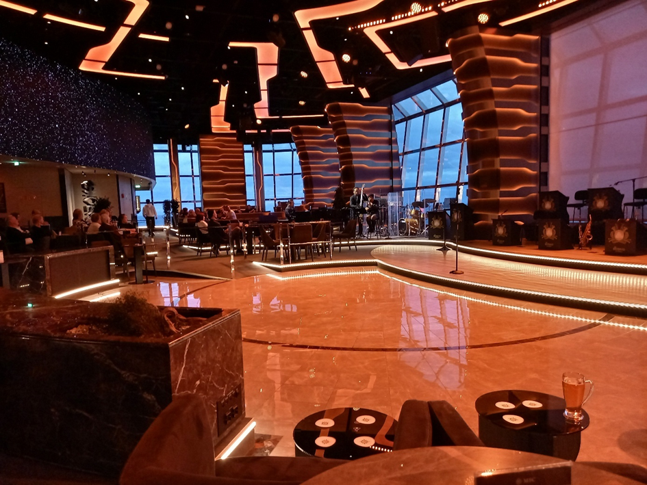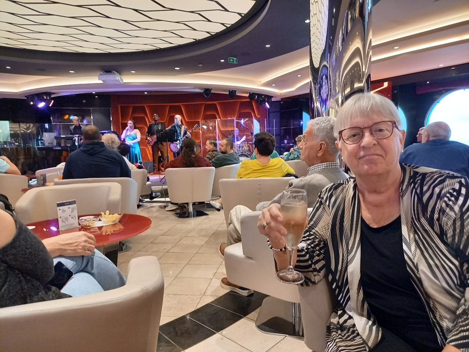 Efter middagen går vi till Aktern och Carousel Lounge en härlig stor lokal som på dagarna har panorama fönster som på kvällen blir fond för underhållningen.