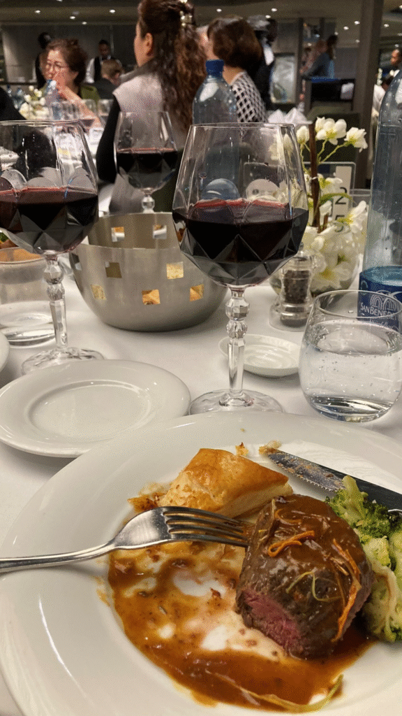 Middagen inleds i vårt fall av en hummerbisque och Amelie väljer en Tournedos och Anders svamprisotto som efterrätt glass som vanligt.