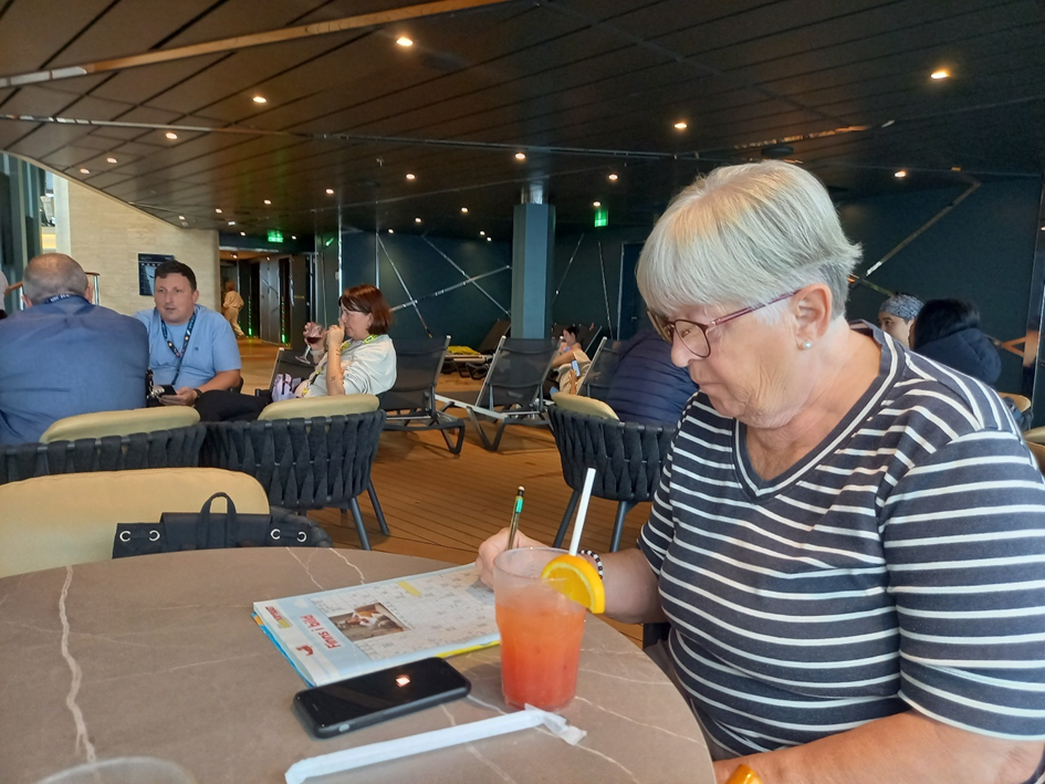 Ute till havs idag, sjön ganska lugn så det är endast svaga rullningar. Under dagen blir det en hel del läsande och provande av de olika barerna och förstås klara av trerätters luncher ovanpå stadig frukost.